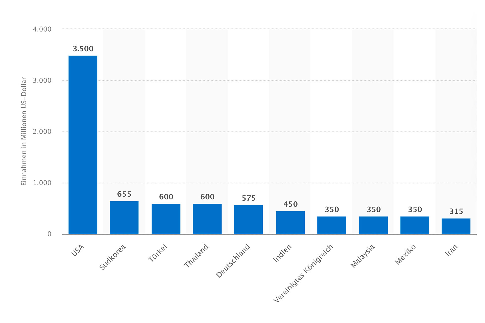 Deutschland befindet sich mit Einnahmen von 575 Millionen US-Dollar an fünfter Stelle.
